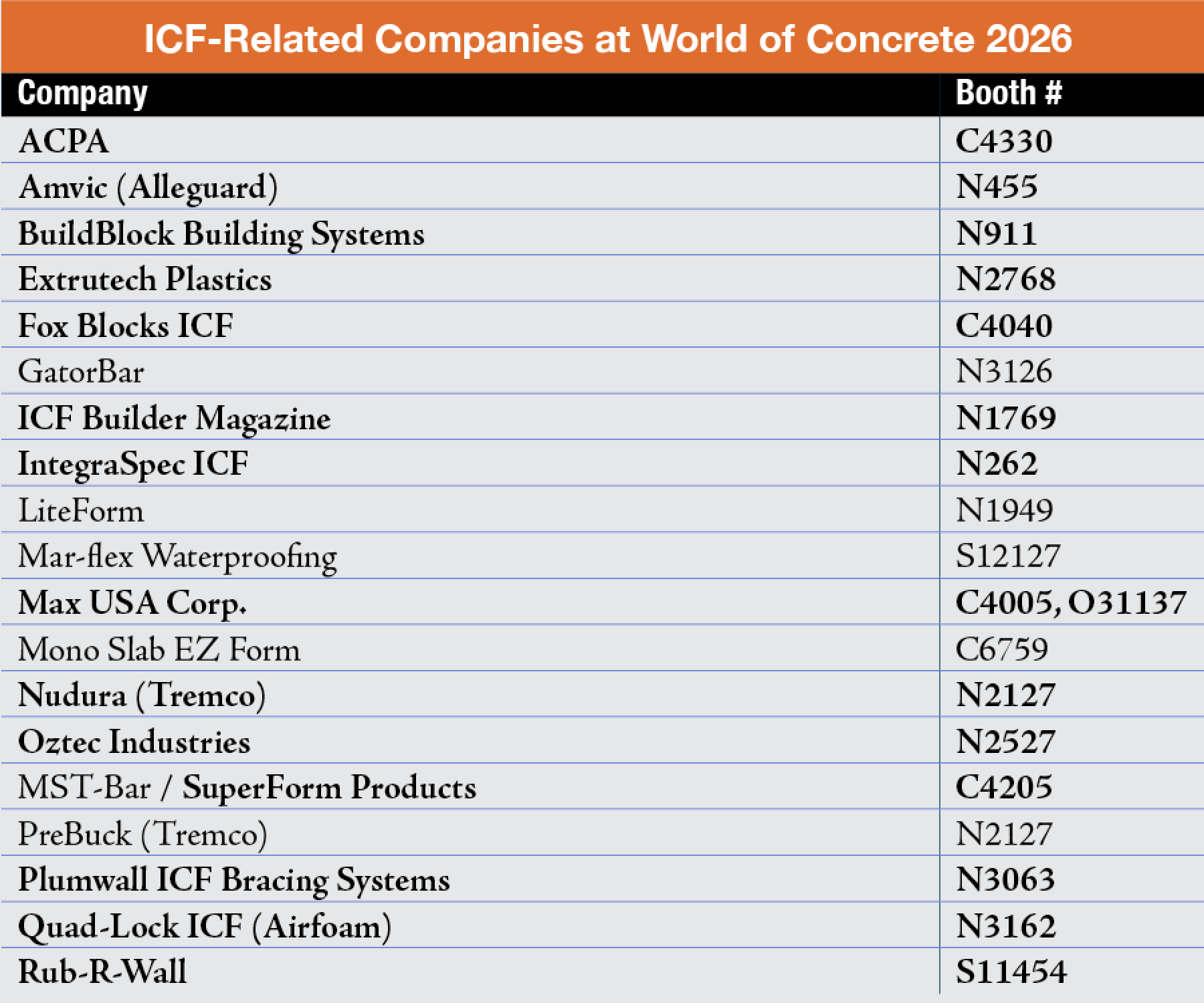 World of Concrete is the best place to connect with manufacturers of ICF systems and accessory products, as well as get continuing education credits, achieve a certification, or attend an informative session to learn something new about concrete. Visit the ICF Builder magazine staff at booth N1769, for industry information and invitations to the 2026 ICF Builder Awards, and to subscribe to the magazine or join the ICF Builder Group. The bolded exhibitor listings at right are advertisers in this issue of the magazine.