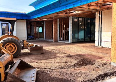 Massive structural steel beams extend from interior to exterior