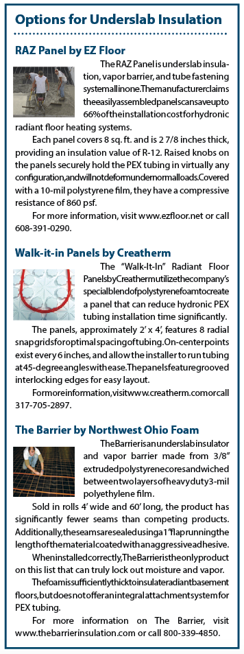 The PEX tubing is attached to the insulation. Until recently about the only way to do this was either using a commercial grade stapler and large plastic staples, or by laying down a wire mesh and using wire ties to attach the tubing to the mesh. Recently there have been some new products to come on the market that incorporate the vapor barrier with the insulation in a shape that permits simply walking the tubing down into the insulation without the need for any specialty tools or exorbitant labor costs. (See Options for Underslab Insulation at left.)