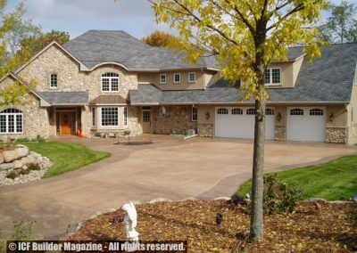 In addition to the exterior walls, the Gornick residence used ICFs in the theater room and elevator shaft to dampen noise. A wall of windows showcases the view overlooking Blackhawk Lake. Radiant in-floor heat, coupled with geothermal heat pumps keep heating and cooling costs of the 9,000 sq. ft. home to less than $750 annually.