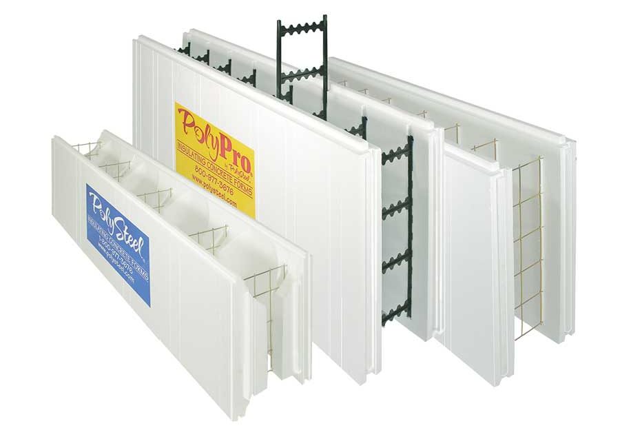 All composite ICFs are screen-grid systems, meaning the concrete forms a series of columns and beams, usually every 16 inches vertically and horizontally. This design means a cubic yard of concrete will fill almost 100 sq. ft. of wall; saving 50% on concrete costs. A screen-grid design uses more foam, which translates to higher R-values and a “greener” product. Many composite ICF brands use 100% recycled foam.