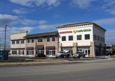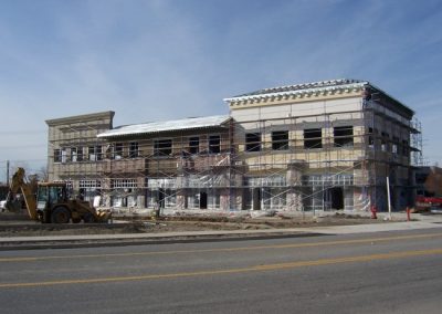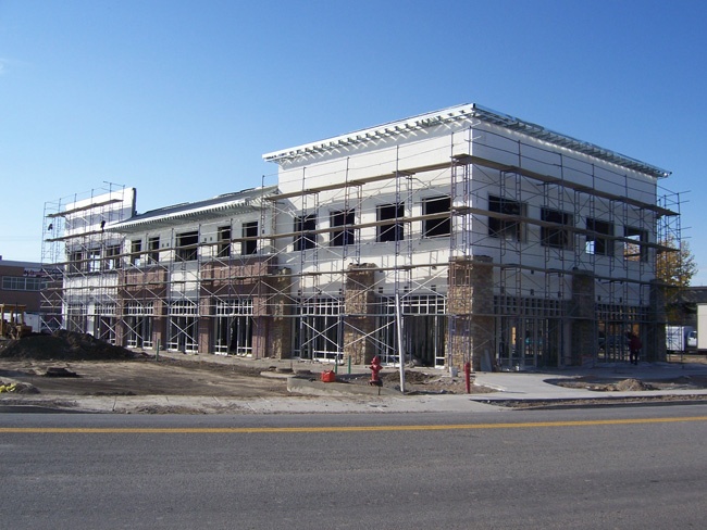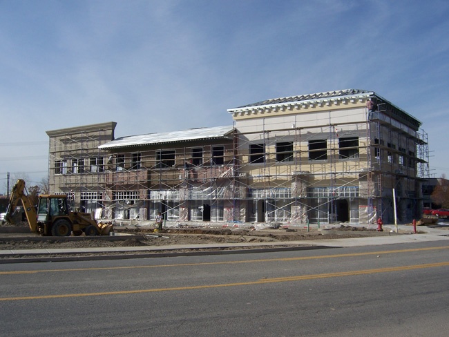 The finished building, designed to look like a collection of individual buildings with its own unique style, is in a prime location visible from the freeway.