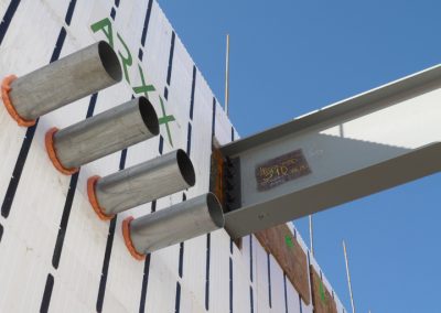 The ICF installer faced a host of significant construction challenges. Because the exterior foam was removed from the first floor walls, perfect consolidation without voids or honeycombing was absolutely essential. (The designer chose Arxx because of the pattern of the interior cavity.) Electrical boxes and hydrant valves had to be placed “blind” inside the cavity, and secured so they would remain perfectly square during the pour.