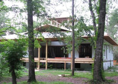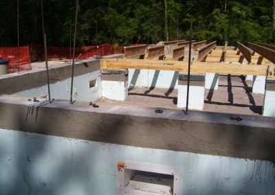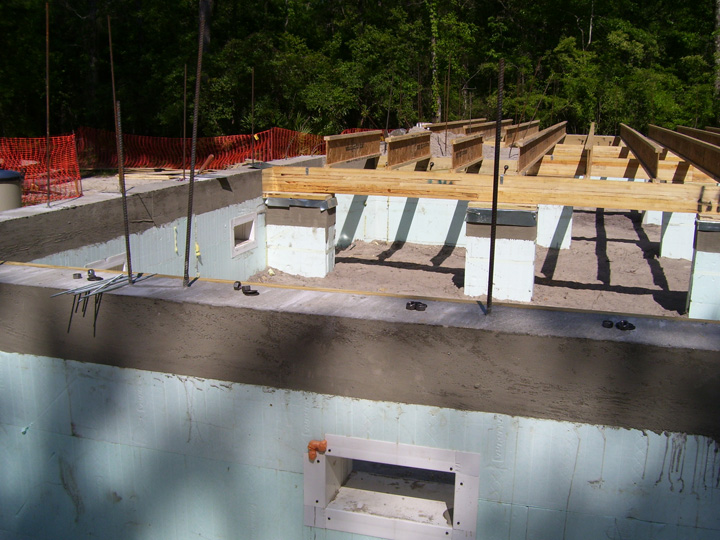 Work was fairly straightforward, with a few sizable challenges. Inspectors required an exposed “Termite Strip,” so builders poured a 12” square exposed concrete lintel atop the foundation forms. Then Hurricane Faye came ashore, raining constantly for weeks and flooding the site with several feet of water.