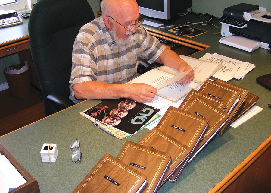 Werner Gregori, inventor of the insulated concrete form, at his desk, reviewing a few of the dozens of photo albums and scrapbooks he’s compiled documenting the infancy and early growth of an industry.