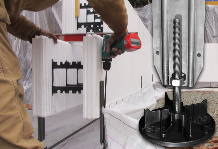 The Fastfoot ICF monopour system eliminates these drawbacks. The system consists of four elements: First, the bottom two courses of ICF blocks are glued into panels three blocks long and two blocks high with a two web offset. Second, two pairs of side supports are screw-attached to each component to suspend it accurately above the ground at the ‘footing’ height. These supports can be quickly and accurately adjusted for height with an electric drill. Third, the Fastfoot fabric membrane is attached with screws to the bottom edge of each large forming panel to form the footing. Fourth, an adjustable bracing system is needed to align the wall.