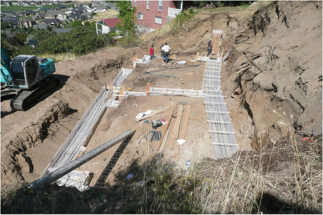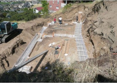 Midway through the excavation, it was determined that the foundation would have to be nine feet deeper than previously thought in order to reach stable soils. This in turn, made it impossible for the excavator to get off the lower part of the lot. “He had literally dug himself into a hole,” says McCullough. “Our solution was to stack and pour the walls in a stair-step manner so the excavator could backfill against the foundation and create a ramp to get out.