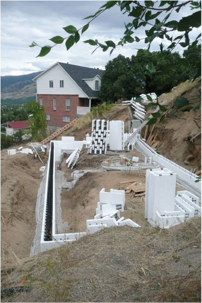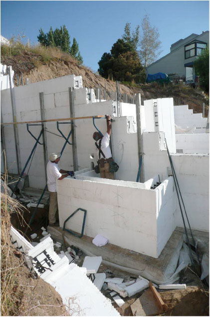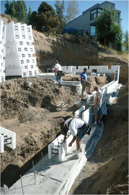 ICFs were used for exterior and interior walls, embankment reinforcement, parapets, foundations for the bridge into the garage, even a lawn bench and pedestal for the air conditioning unit. In all, the job used just under 1,500 ICF blocks.