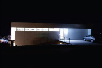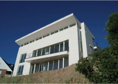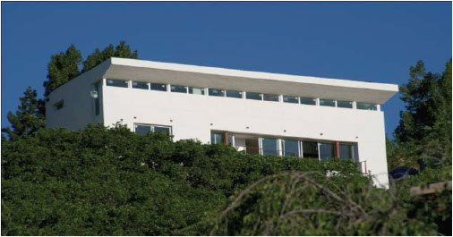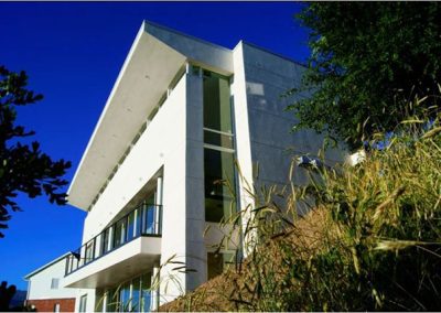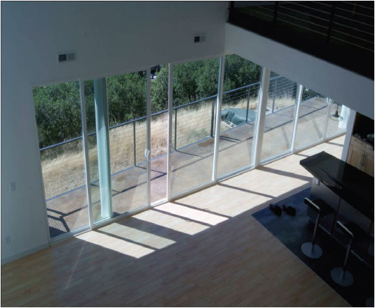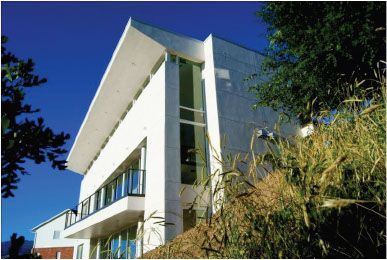 to take maximum advantage of winter solar gain and summer shading. Radiant heat in the concrete floor is combined with a concrete/EPS decking system to maximize efficiency and reinforce the unusual design.
