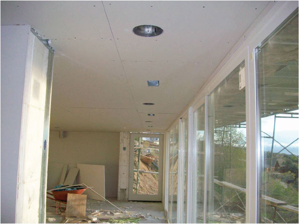 Ceilings were not to be tied into the walls, but float six inches away from the finished interior surface. Other exterior walls are separated from each other on