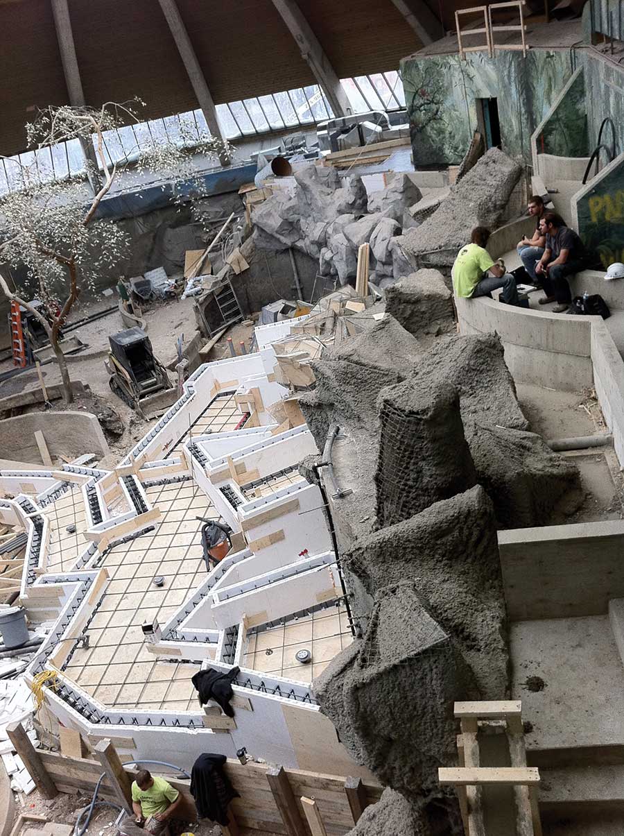 It took Klassen and his crew of 12 almost four months and 1,500 bags of carve coat to construct the massive rockscapes of Toucan Ridge. A few additional weeks were needed to stain the rocks, add moss and other effects.