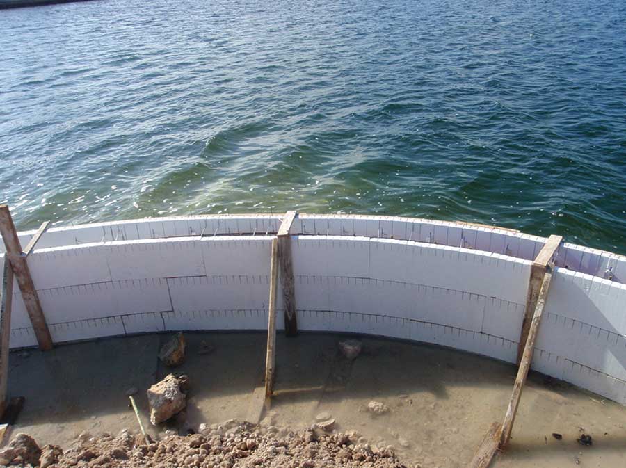 Pouring curved footings underwater presented a challenge. The team chose to use the Fast Foot Foundation System as the wave action would not damage the fabric footing form.
