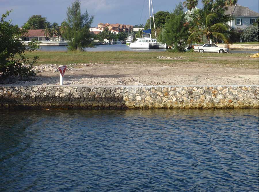 Sam Small, a professional engineer and Quad-Lock distributor based in the Cayman Islands, was asked to prepare a bid to repair and/or replace 260 linear feet of seawall in an exclusive gated community on the island. About a third of the wall, built of unreinforced cobblestone masonry, had already collapsed.