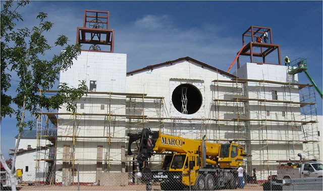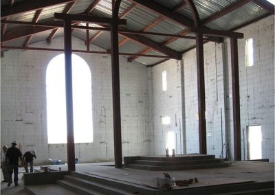 Completed in 2009, the 30,115 sq. ft. church used ICFs for virtually every wall. The complex design includes numerous T-corners, arched and round windows and 46 integrated pilasters. Interior ICF walls reach to 50 feet without intermediate supports. Buttress walls and two free-standing bell towers were also built from ICFs. In total, the project used well over 58,000 sq. ft of ICFs.