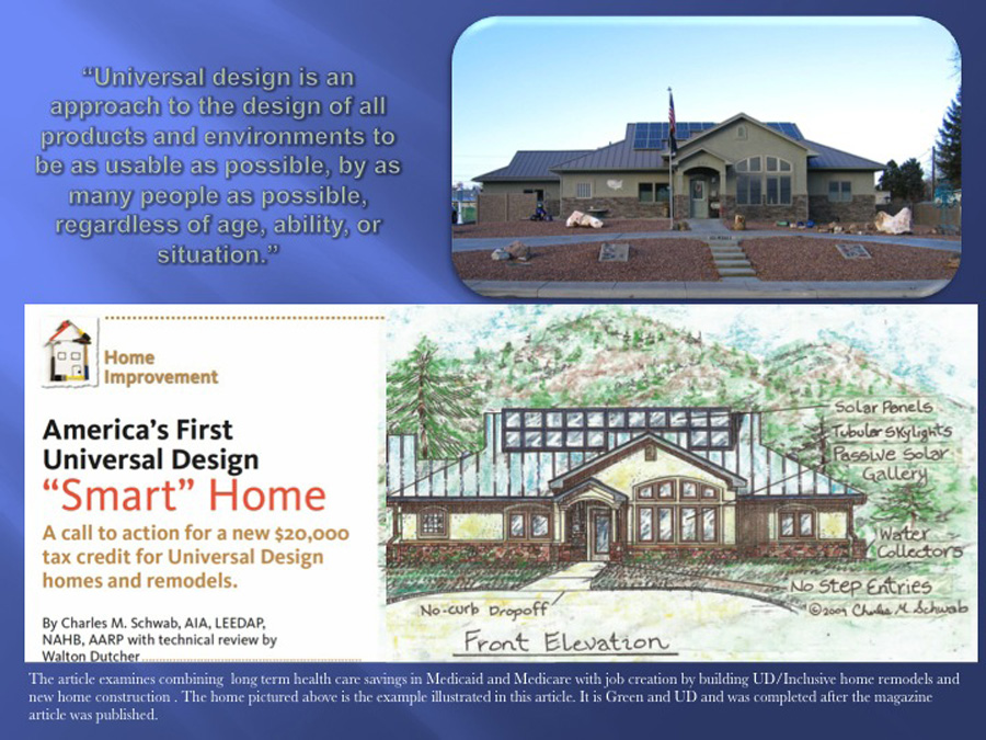 UD also pays attention to layout and dimensions, incorporating well-known accessibility features such as wide doors, lowered sinks, non-skid flooring, etc. Proponents claim the concept will save both the homeowner and the government tens of thousands of dollars by allowing the retired and the handicapped population to live independently in their home environment instead of retirement homes, assisted living centers and institutions. The long term healthcare savings may be as high as $100,000 per person per year.