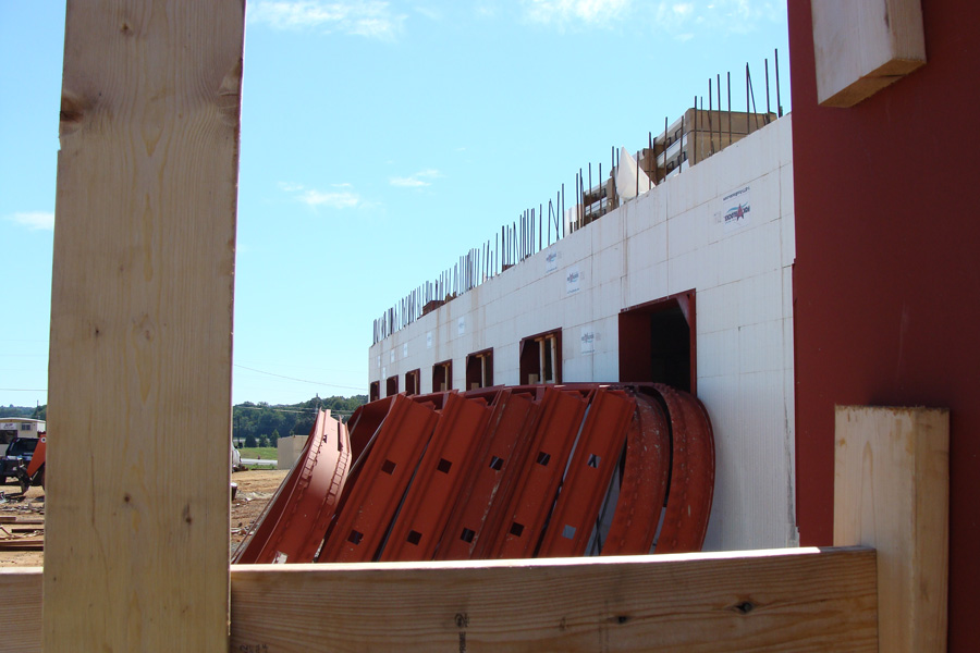 Footers were poured in April 2011, with school scheduled to begin in the facility in less than 18 months. Despite the seemingly constant rain, the walls rose steadily under the experienced installation crews of Empire/Hidden Valley. On good weather days, they were able work long hours, sometimes placing hundreds of yards of ready-mix daily. Their hard work and expertise kept the construction on schedule for Alliance Corp., the GC. Josh Oestricher at Stala reports that the ICF installers could have moved even faster (to less than a 60-day build) if conventional building trades could have stayed out of their way.