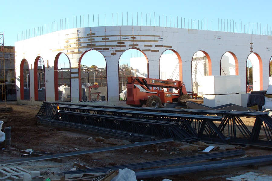 The steel frames from Stala were pre-engineered to include returns and closures to coordinate finishes to accomplish a professional appearance. For the radius walls, the Stala bucks were fabricated with a specialized “double radius” head, bending in two planes simultaneously. The massive radius wall, built with 12˝ core Fox Blocks ICFs topped out at a height of 52 feet. Other areas used the 8˝ form.