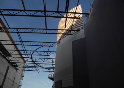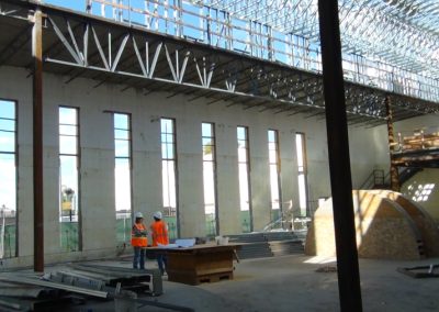 - Towering 50’ high ICF radius wall supports steel dome roof