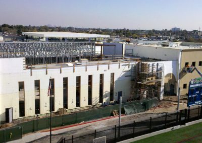 The scale of the project is massive. With a footprint of 82,500 sq. ft, it called for 98,000 sq. ft. walls to be erected with BuildBlock ICF. That works out to be all exterior and nearly all interior walls—plus and additional 5,000 sq. ft. of ICFs used in landscaping. ICF was used for virtually everything, including multiple ICF elevator shafts, stairwells, parapets, sidewalks, even baseball dugouts. The Fetters report even some of the bathroom stall dividers are ICF. The modified Giraffe Brace system they used was able to handle both the tall walls and the tight spaces without budging.