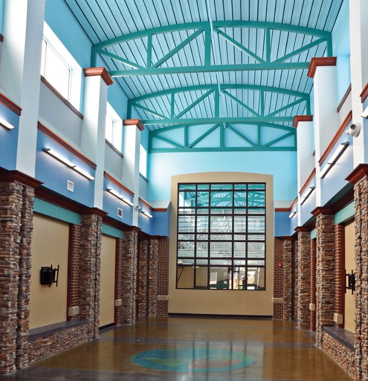 The building was laid out in a north-south site orientation to increase solar output and naturally conserve energy. A clerestory spine—basically a line of windows at the top of both walls in the central hallway—runs down the middle of the building to increase natural light and minimize lighting costs.