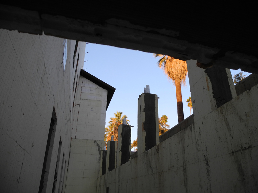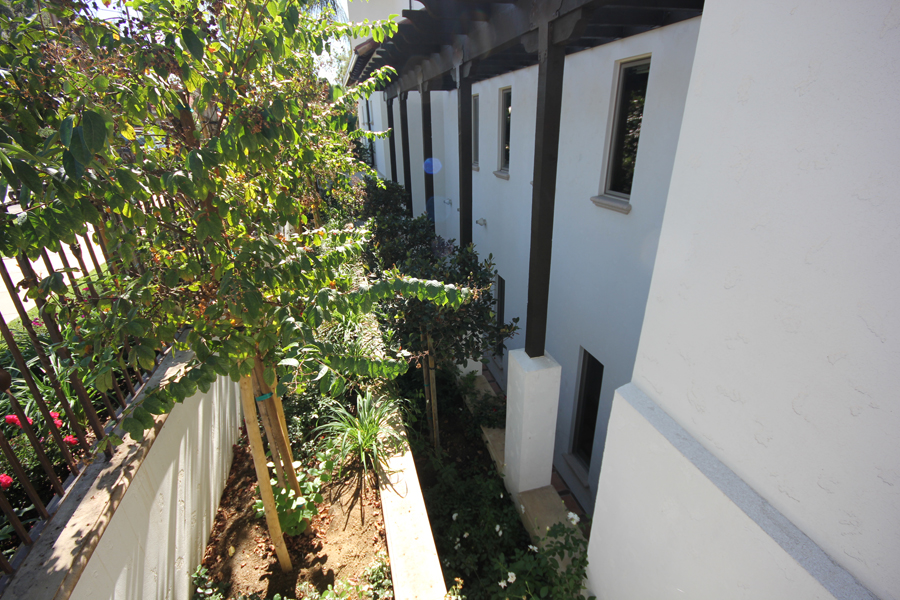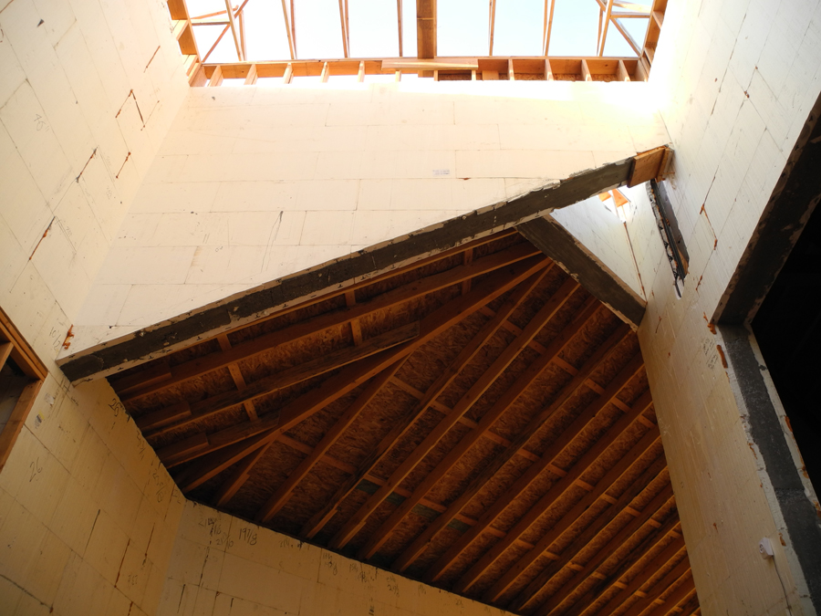 In order to meet lot setback and height restrictions, the building required a large basement, which was formed with ICFs. The 12-foot-tall retaining wall outside the basement was also formed with ICF, with the space between them used as an outdoor atrium. The two ICF walls reinforce each other with a series of connecting concrete walkways and flying buttresses, also formed with ICF. The installer proved his competence installing these, some of which are set at a 45-degree angle 18 feet above the floor. The design also included numerous unusual angles, T-intersections, and ICF concrete columns to support deck posts. Finally, Southern California is a noted earthquake zone, so the installer also had to ensure the heavy double-curtain of rebar was properly placed to meet seismic (Zone 4) requirements.