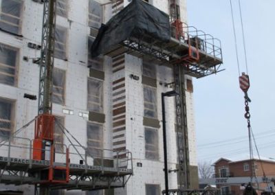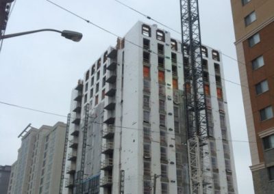 The entire building was 12” ICF walls and heavily reinforced. The exterior free standing wing wall, which begins on the 11th floor, was not originally designed as ICF but it soon became apparent that it would be faster and easier if it were. The contractors had a welded angled steel support cast into the concrete on the floor below and from there up the wing wall sat atop of this and just became part of the poured wall. A similar technique was used to form the free standing wing walls on the balconies. Interior “exit walls” leading up to stairwells and elevator shafts were also built with ICF. The only exterior area that isn’t ICF is the 22-foot-high paladium entrance, which used a mix of steel forms and ICF due to the large concrete columns needed for support.