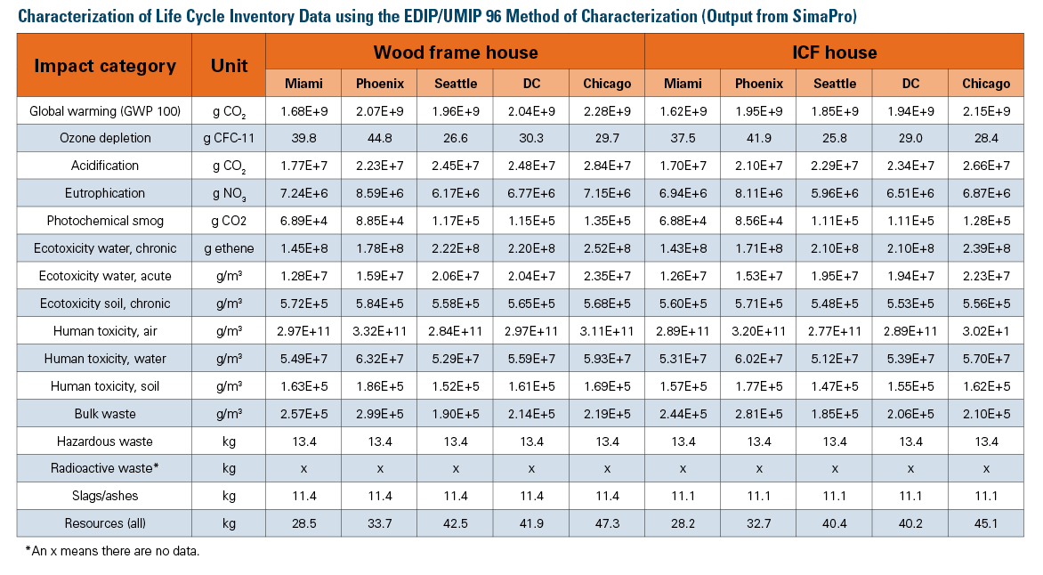 The executive summary summarizes, “The results show that in almost all cases, for any given climate, the environmental impact in each category is greater (worse) for the wood house than for the ICF house. The largest impacts are in the form of depletion of fossil fuel reserves (categorized as damage to natural resources) and release to the air of respiratory inorganics (categorized as damage to human health). Among the construction products used in the house, wood products and copper tubing have the largest environmental load, followed by cement-based materials.”