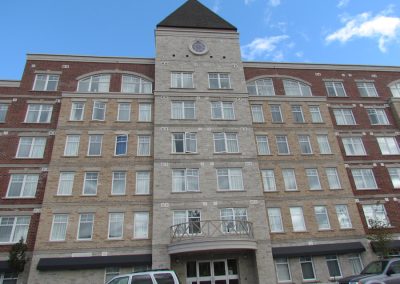 Fortunately, the ICF installation crew from Elite was experienced, and worked though all of these issues without delay. They also innovated a few developments. For instance, the two levels of underground parking required exposed concrete walls, but with the rear of the building right on the lot line, the use of conventional forms was impossible. Instead, this was formed with ICFs, and the EPS stripped off the inside face afterwards and painted. This technique was also used for the elevator shafts and stairwells. In another innovation, they used brickledge blocks to create the corbels that support the stairwell landings.