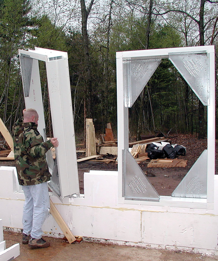 EPS bucking systems offer better insulation values, but need extensive wooden reinforcement until the concrete sets. They can be site-fabricated from regular straight ICF forms by cutting the ties down the middle and ripping the panel to match the core width of the form. The cut half-ties anchor the bucks to the concrete; the furring strips provide attachment points for the window and door frames.