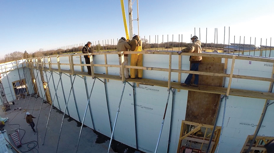 The two most important points in an ICF build is when it comes off the footing, and the day of the pour. If the form distributor or ICF consultant has offered technical assistance, they should visit the jobsite and inspect every detail prior to pour day, checking the bracing, scaffold planks, wall reinforcement, bucking and so forth.
