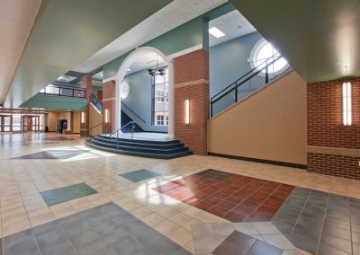 High quality materials, such as brick veneer, stone accents, porcelain tile, and EPS trim highlight the public venue elements of the school.