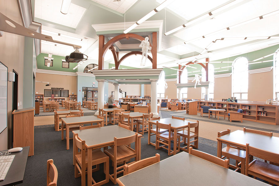 Kenny Stanfield at architectural firm Sherman Carter Barnhart (SCB) was the lead designer on the project. He says the school was originally envisioned as two separate buildings, but combining them saved money, space and energy. The final design consists of two wings, each housing a separate school with its own gyms, cafeteria, and library. The high school portion has 65 classrooms; the middle school has 48. The two wings join at a shared auditorium and kitchen. The gyms and cafeterias (which double as additional gym space) are adjacent to the auditorium, which allows administrators to unlock them for after-hours events without having to open either school.