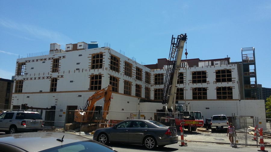 The project was built on an extremely tight site on “Museum Row.” The site was so tight that the majority of the construction materials had to be lifted in from the adjacent parking garage and set inside the project since lay down areas outside the building footprint were virtually non-existent.