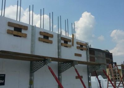 In addition to the exterior walls, ICFs were utilized for all load bearing interior walls, with “one-sided” forms used for elevator shafts and stairwells. Floors were precast concrete. Morris says, “This combination of ICF cast-in-place walls and pre-cast floors synched perfectly to hit the aggressive schedule set by Dunn Hospitality.”