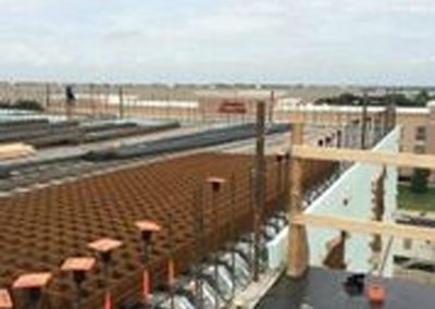 First floor walls are 16 feet tall and required eight-inch-core forms to meet engineering requirements. Subsequent floors used six-inch-core blocks. All exterior walls plus interior corridor walls are ICF. Walls between rooms are light-gauge steel. Floors were poured in place using a steel pan decking system, with the 3.5-inch-thick reinforced concrete slabs spanning from outside wall to the structural bearing hall walls, usually between 26 and 32 feet.