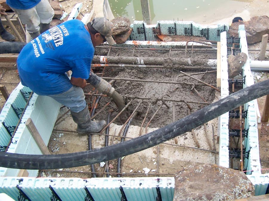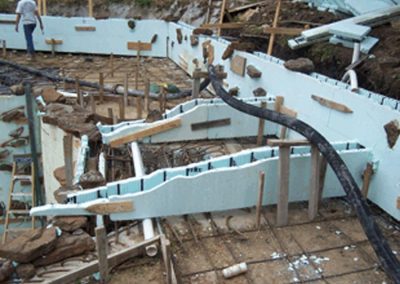 The water feature and pump room were next, and offered the installers plenty of opportunities to display their craftsmanship. That area features an arched opening, several custom-cut corners, sculptured ICFs to match the look of a natural stone ridge, and even embedded rocks. The area also has an elevated concrete deck. It cantilevers the waterfall out past the rock face into the swimming pool below.