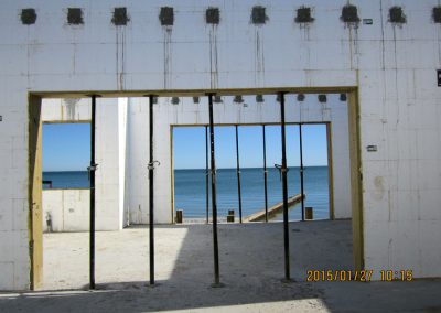 The first challenge was getting the foundation into place. The site is literally beach sand, with the back of the house sitting just a few feet from the high tide mark. To stabilize the foundation, more than 400 wooden piers were driven 20 feet deep and tied together with 42-inch grade beams, with the slab height 66 inches above the average high water mark.