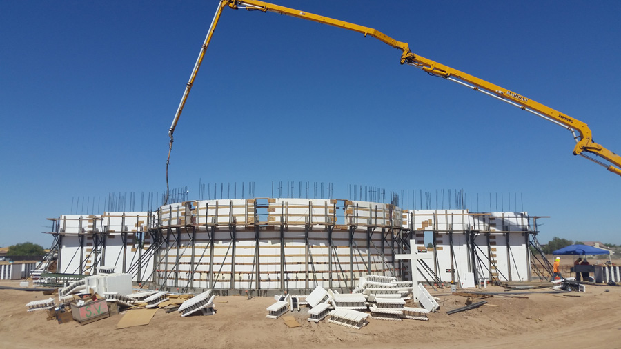 St. Juan Diego Catholic Church, in Chandler, Arizona, is the latest of more than a dozen major ICF projects undertaken by the Catholic Archdiocese of Phoenix. It’s an exceptionally complex and ICF-intensive project. With just more than 22,500 sq. ft. of floor, it used more than 41,000 sq. ft. of ICFs—a ratio of almost 2:1—due to the decision to build most of the interior walls with insulated formwork as well.