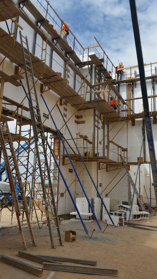 In order to meet the tight schedule (68 weeks), multiple trades were nearly always working at the same time. Daily morning meetings helped alleviate conflicts. Fetters reports that the meetings brought everyone together as a team and the respect from each company was evident. He also developed his own “walk-under” wall bracing, which allows access to the lower wall while the upper sections are still being stacked and poured.