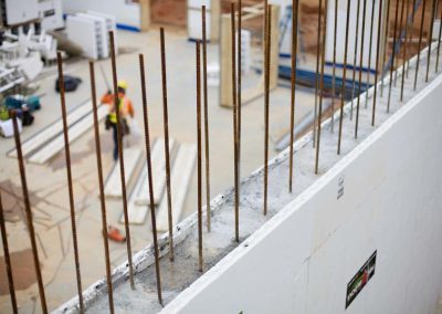 McCosby says, “Literally hundreds of embeds were placed in the wall for steel framing attachments, as well as large and complex steel reinforcing, such as the gym walls, which required heavy double-mat steel reinforcing. There is an area on the first level that has a 12-foot high opening with a 36-foot clear span that carries the entire second floor walls and floors.”