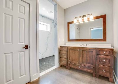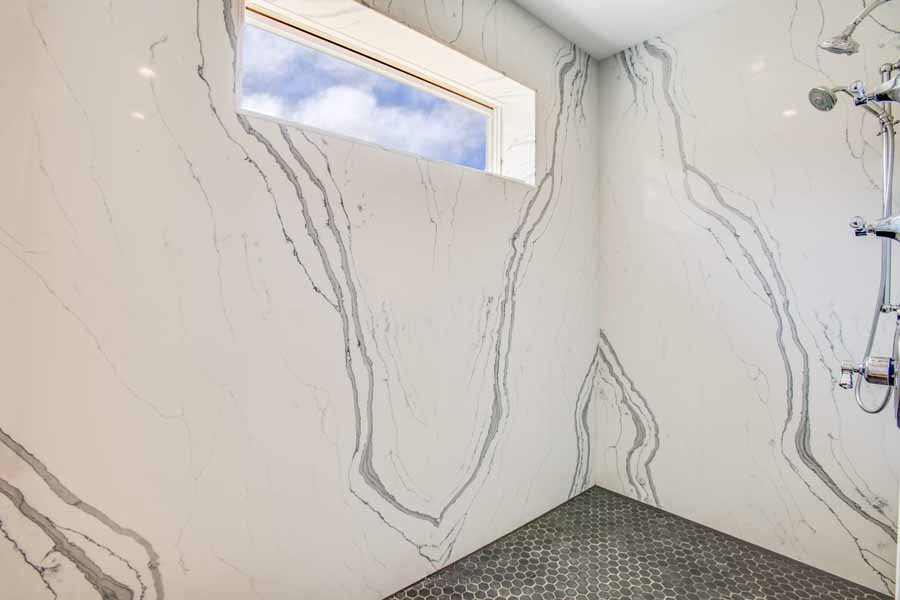 During construction, the owners lived less than 100 feet away, and visited the site frequently. Floors are stained polished concrete, and the craftsmanship is impeccable. The shower surround, for instance, features bookmatched marble panels.