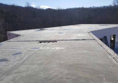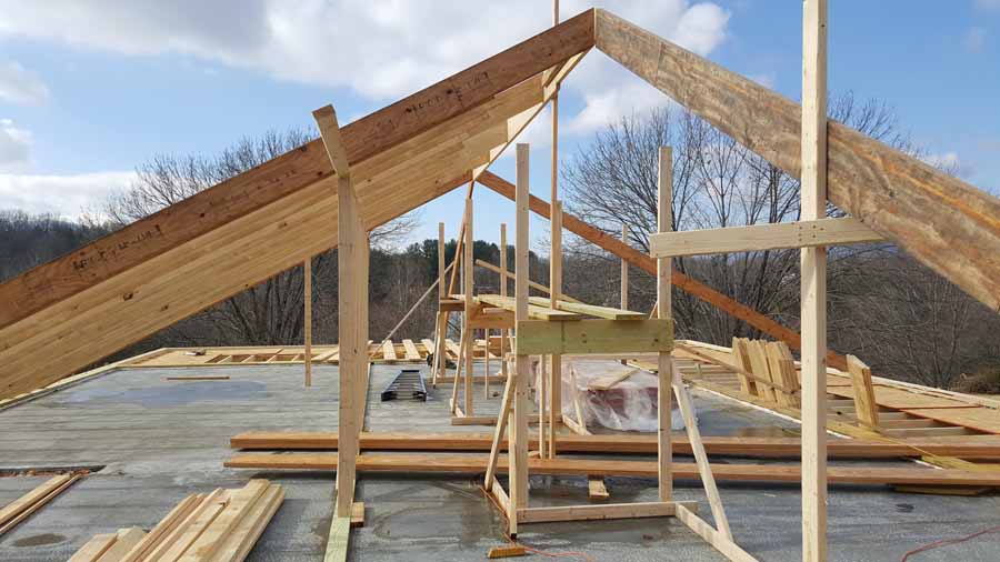 The flat concrete ceiling is insulated with closed-cell spray foam to obtain R-49 insulation and capped with a sloped wood-frame roof.