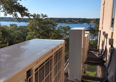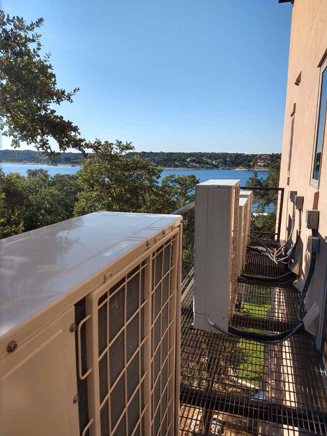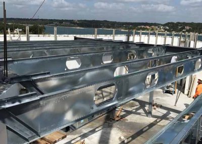 Due to flood requirements, the mechanical equipment had to be installed 30 feet above ground. A metal cantilever deck was suspended off the exterior ICF walls to provide a platform for the A/C and other equipment.