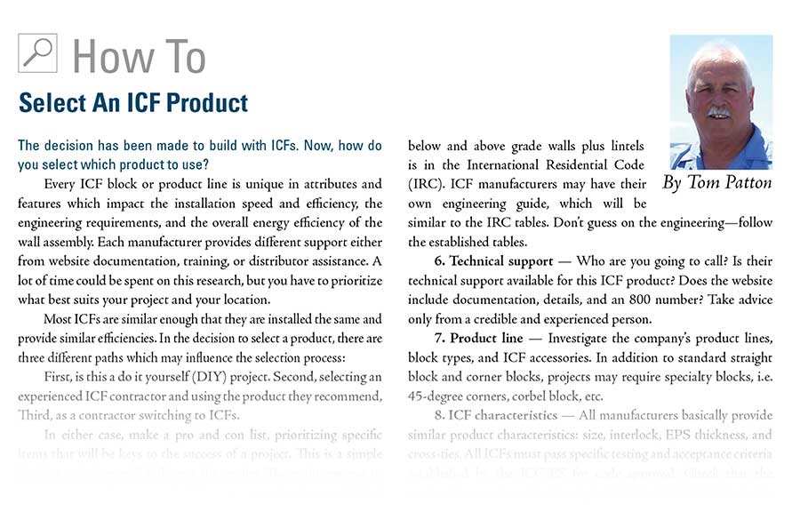 1. Major product line or regional product — Major manufacturers provide product experience, code approval documentation, larger product lines, more support, and more availability. Regional products may be limited in resources, product lines, and support. Use ICF Builder Magazine’s ICF Comparison chart: https://icfmag.com/icf-comparison-chart/)