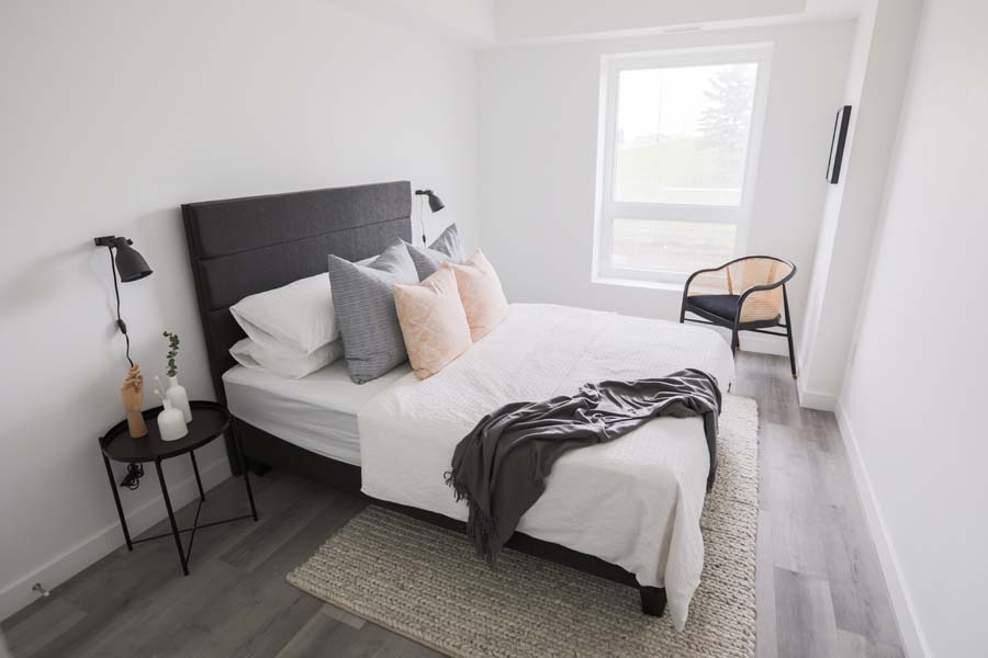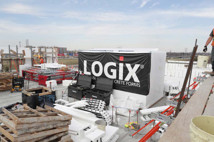 These apartments in Winnipeg, Manitoba, are seven stories perched upon a cast-in-place parkade, with a 14,041-square-foot footprint. The apartments will provide much-needed housing near the University of Manitoba, and also serves as a model for the next phase(s) with this owner. One hundred percent of the exterior walls were built with 6-inch blocks, along with the demising walls of 8-inch blocks. Logix Pro Bucks allowed window openings to be bucked pre-pour and the window units installed post-pour. There were 24 wall jogs per level and 24 corner jogs per level for inset balconies. Dimensions were not optimized for Logix corners so AMC wire-cut special dimensions to save on-site labor.
