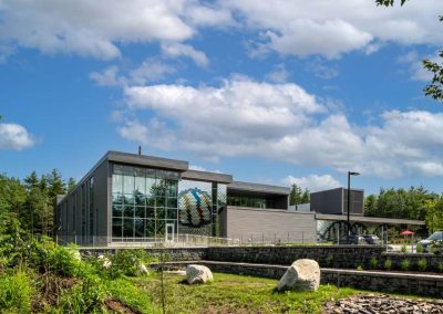 Due to the contaminating nature of materials used within the lab, the building required clean room walls that could be cleaned multiple times daily by MMQCI. The metal wall panels utilized, which are honeycombed in the middle and covered with a uPVC coating, were joined together and slid into a metal slot along a floor track to construct the walls that support safe operations. Because of the lab air pressures, the building must have the capability to intake a large volume of outside air, filter it and distribute it to lab spaces. This process is achieved through the building’s Energy Recovery Unit (ERU). During Maine winters, the building unintentionally sucks in snow and ice; however, when excess moisture is introduced into the ERU, it has to be shut down. To mitigate the risk of shut down in the snowy, icy winter, snow rooms were designed and constructed. The snow rooms — located directly between the exterior and ERU mechanical room — take in the winter elements through giant louvers. The snow and ice that enters the rooms through the louvers hit the baffles within the snow room walls, fall to the floor, melt, then drain to the exterior. With the snow rooms, the snow and ice are prevented from making it into the ERU, mitigating the risk of ERU system shut down due to moisture entry.