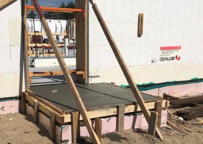 The team also managed a challenging ICF installation for floor-to-floor slab placements. The slab had to stop below the second-floor decking on the inside but run higher than the decking on the outside. The project team integrated the ICF blocks to serve as the pour stop for the slab pour into the top of the wall so that the form was continuous, rather than going out and forming up the edge of the slab. The team sequenced the floor-to-floor placement rather than splitting the process into smaller portions. “Coupled with the 15-foot height of the placements, the sequencing reduced the number of placements, and therefore saved time on the overall schedule,” says Versprille.