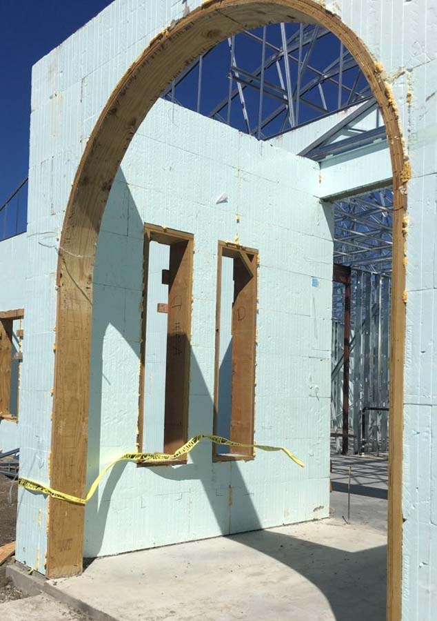 Complex architectural elements included towering gables and ceiling, and poured arches including stained glass circles. Exceptional workmanship was demonstrated in the implementation of the poured arch openings which required special attention to bracing to ensure that the arches were maintained as specified. “Some ICF installers tend to shy away from poured arches,” says Ware, of J&E Companies. “Not this installer.” In addition to the complexities, this project had an aggressive timeline which was maintained by both Steele Freeman, the general contractor, and J&E Companies. Typical north Texas weather produced many days where the J&E installation team worked in poor weather conditions in order to stay on schedule.