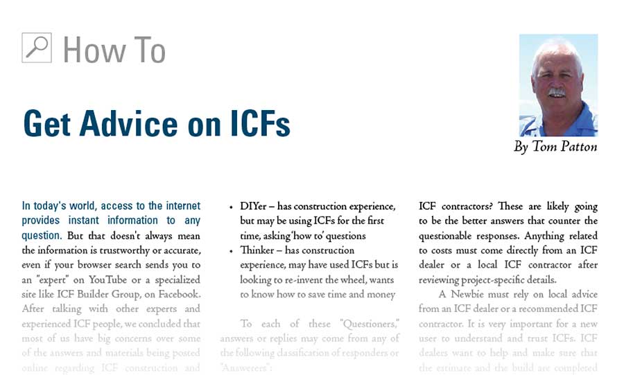 To gain the best possible answer, add in as much detail as possible to the question. The bottom line is to evaluate all responses from social media. Answers must meet building code standards, engineering principles, and manufacturer recommendations for the area of construction. Because ICFs create the structure of the building, the design and installation requirements may be different related to many localized variables such as local codes, climate, seismic, wind, soils, etc. Building in the southern U.S. is not the same as building in the north, east, or west. If you are not sure about a response you got, talk specifically to a manufacturers’ rep, dealer, or experienced ICF contractor. Understand that you will be building a high-performance, reinforced concrete building, following specific design and application principles that have been developed and are used as standards. Use and follow the free advice offered by ICF manufacturers — installation instructions, technical documents, and details, that will make the design and build easier and more efficient.