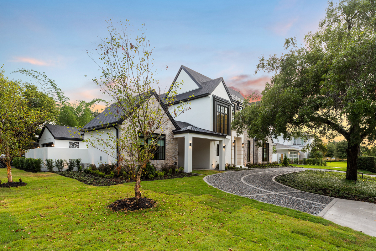 The intricate architectural features of this home also include two gable end features with black trim on a white painted